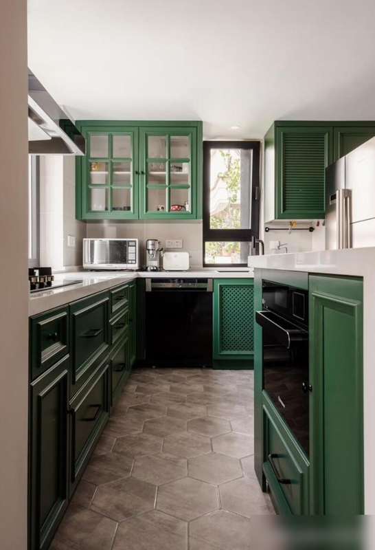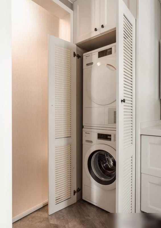 L型橱柜用墨绿撞奶白,清爽好打理;干湿分区让卫生间井井有条,洗手台下的百叶柜门透气又防潮,洗衣机烘干机嵌入柜体严丝合缝。