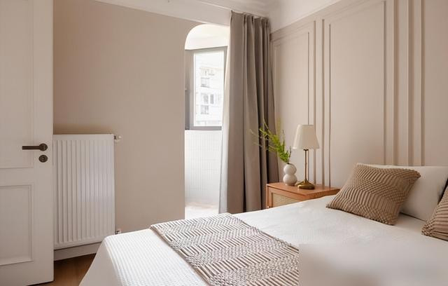 石膏线背景墙拉高了空间感,小阳台挂上遮光帘,睡眠休闲两不误。
