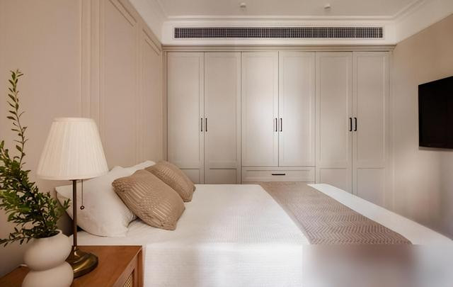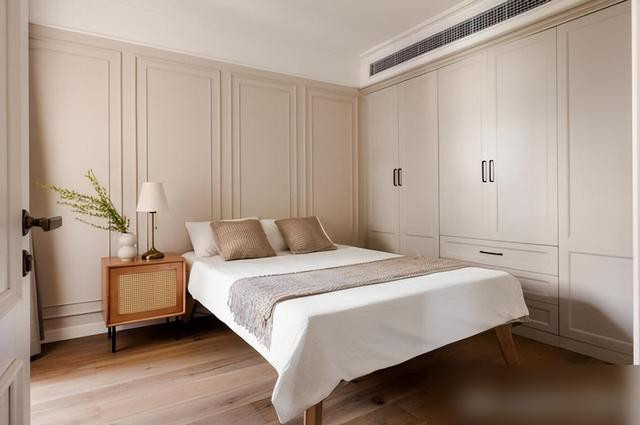 卧室延续了整体风格,高脚床配整墙衣柜,简约却不简单。
