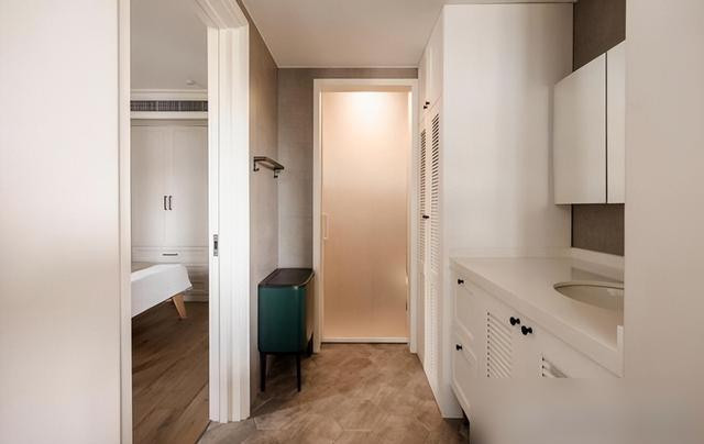 设计师在入口处挤出个小储物间,长虹玻璃折叠门既遮丑又透光,旁边嵌入鞋柜,换鞋收纳一气呵成。